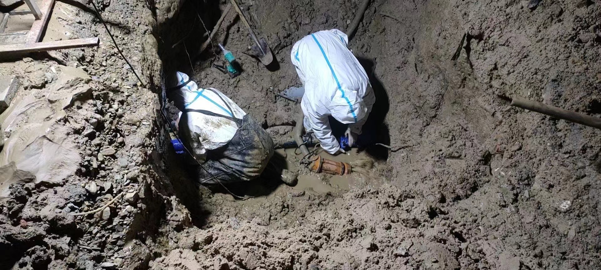 3月15日晚9點多,鲅魚圈分公司接到宋屯小區(qū)物業(yè)的求助電話,小區(qū)內(nèi)主路有大量積水,疑是自來水管道漏水,宋屯小區(qū)全部停水,分公司維修隊全體成員在隊長唐有的帶領下,迅速做好個人防護,對人員和設備及材料進行消殺后,第一時間奔赴漏水現(xiàn)場。經(jīng)詳實探查發(fā)現(xiàn)是通往宋屯小區(qū)的供水DN900mm主管道管網(wǎng)漏水,現(xiàn)場電、氣、通訊等各條線路縱橫交錯,給搶修工作帶來巨大不便,唐有和隊員們迎難而上,在零下10多度的低溫下輪流上陣,用鐵鍬一點一點掏挖出操作空間。厚重的防護服、護目鏡等防護用具使搶修人員們的動作顯得有些笨拙,憑借著豐富的搶修經(jīng)驗,夜里12時許將漏點挖出,直至凌晨1點半,恢復了宋屯小區(qū)的正常供水。