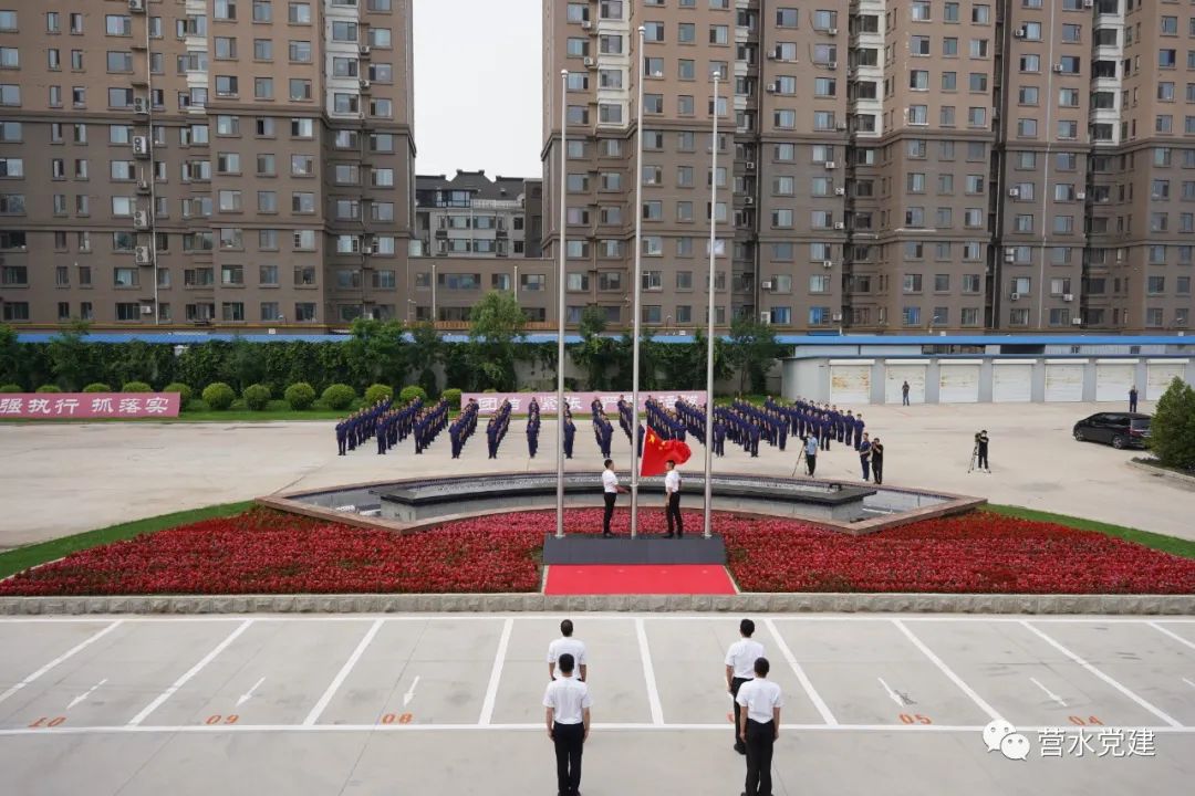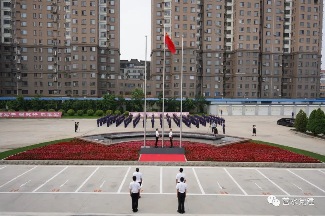 全體黨員整齊著裝,在辦公樓前列隊,英姿颯爽的護(hù)旗手邁著鏗鏘有力的步伐,托舉五星紅旗走向升旗臺。