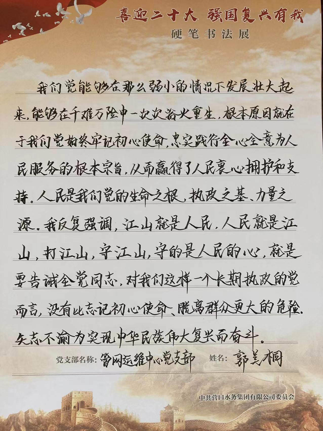 為深入學(xué)習(xí)貫徹習(xí)近平新時(shí)代中國特色社會主義思想,結(jié)合“強(qiáng)國復(fù)興有我”群眾性主題宣傳活動(dòng),水務(wù)集團(tuán)組織開展“喜迎二十大 強(qiáng)國復(fù)興有我”硬筆書法展。
